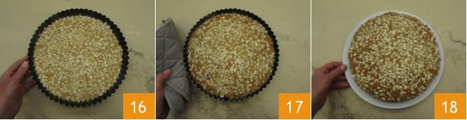 Zu diesem Zeitpunkt 16 backen Sie es in einem auf 180° vorgeheizten statischen Ofen für 30 Minuten, dann ändern Sie die Einstellung auf Umluft und backen Sie für weitere 5 Minuten, um die Oberfläche des Kuchens leicht zu karamellisieren. Nehmen Sie den Kuchen aus dem Ofen 17 und lassen Sie ihn abkühlen, bevor Sie ihn entformen und servieren 18.