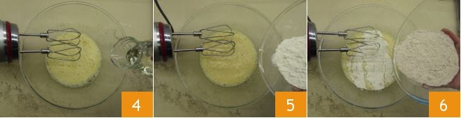 Fügen Sie bei laufendem Mixer das Öl in einem dünnen Strahl hinzu 4. Geben Sie dann das gesiebte Mehl 5 und das Vollkornmehl 6 hinzu,