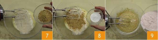 das Haselnussmehl 7 und das gesiebte Backpulver 8. Arbeiten Sie weiter mit dem Mixer, bis Sie eine homogene Masse erhalten. Fügen Sie dann den Joghurt hinzu 9,