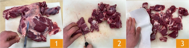 Für das Lammragout mit Artischocken zunächst die ausgelöste Lammkeule bzw. -schulter von den härteren Fettstellen befreien, dabei etwas Fett stehen lassen, damit die Sauce Geschmack und Glanz bekommt 1. Das Fleisch in Würfel von 3–4 cm schneiden 2 und mit Küchenpapier gut trocken tupfen 3: so wird es beim Anbraten besser gebräunt.