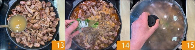 Mit dem Weißwein ablöschen 10 und den Bratensatz mit einem Holzlöffel gut abkratzen, um alle karamellisierten Säfte zu lösen 11. Nun die Lammstücke wieder in die Pfanne geben 12.