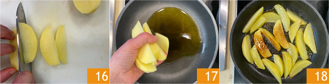 In der Zwischenzeit die Kartoffeln schälen und in Spalten schneiden 16. In einer separaten Pfanne etwas Öl erhitzen, die Kartoffeln dazugeben 17, leicht salzen und bei mittelhoher Hitze etwa 10–15 Minuten goldbraun braten 18.