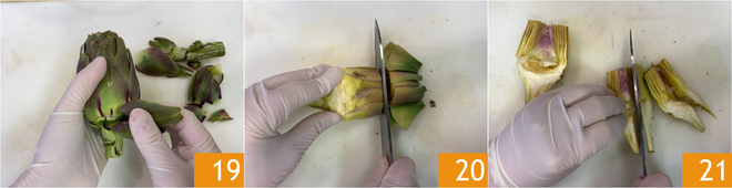 In der Zwischenzeit die Artischocken putzen: die äußeren, harten Blätter entfernen 19, dann die Spitzen abschneiden 20 und das „Heu“ entfernen. Schließlich die Artischocken in Scheiben schneiden 21.