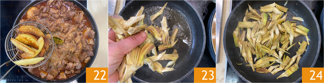 Sobald die Kartoffeln goldbraun sind, diese zum inzwischen zarten Lamm geben 22. In derselben Pfanne, in der die Kartoffeln gebraten wurden, die Artischocken hinzufügen 23 und bei mittlerer Hitze etwa zehn Minuten anbraten 24. Mit Salz und Pfeffer abschmecken.