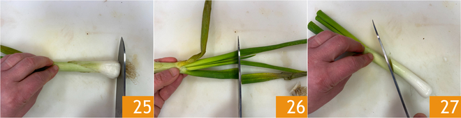 Nun die Frühlingszwiebeln vorbereiten: die äußere Schicht entfernen, dann das untere Ende abschneiden 25 und etwa 2–3 cm des grünen Teils stehen lassen 26. Zum Schluss die Frühlingszwiebeln der Länge nach halbieren 27.