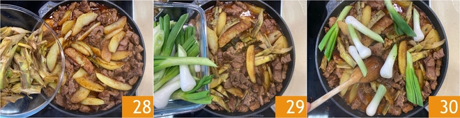 Wenn die Artischocken Farbe angenommen haben, aber noch Biss besitzen, diese ebenfalls zum Lamm geben 28. Die Frühlingszwiebeln zugeben 29 und ohne Deckel weitere 15 Minuten bei niedriger Hitze fertig garen, dabei vorsichtig umrühren 30. Sollte die Flüssigkeit zu dünn sein, die Garzeit um einige Minuten verlängern; sollte sie zu stark einkochen, mit wenig heißer Brühe auffüllen. Am Ende das Ragout zugedeckt 5–10 Minuten ruhen lassen, damit sich die Aromen besser verbinden.