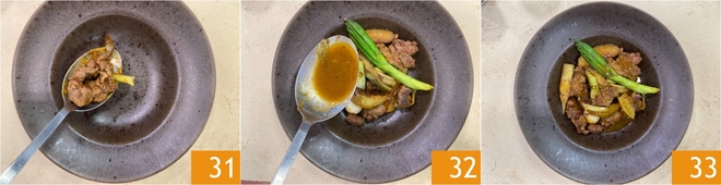 Das Fleisch 31 mit dem Gemüse anrichten und mit der Bratflüssigkeit beträufeln 32. Ihr Lammragout mit Artischocken ist servierbereit 33!