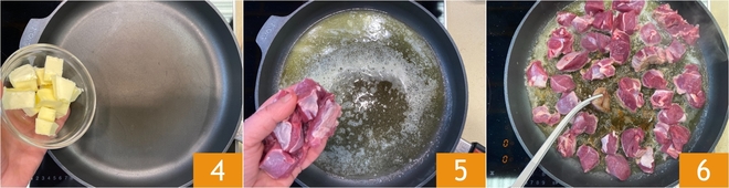 In einer großen Pfanne die Butter 4 zusammen mit dem Olivenöl erhitzen. Nach und nach nur wenige Fleischstücke gleichzeitig zugeben 5, so dass sie in einer einzigen Schicht liegen, und bei starker Hitze rundherum 4–5 Minuten anbraten 6.