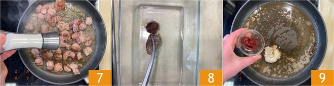 Erst wenn das Fleisch gut gebräunt ist, salzen 7 und pfeffern. Das Lamm aus der Pfanne nehmen und beiseitestellen 8. In derselben Pfanne die halbierte Knoblauchknolle auf das Bratgut legen und anrösten, dann das Tomatenmark hinzufügen 9. Das Tomatenmark etwa eine Minute anrösten und dabei gut umrühren.