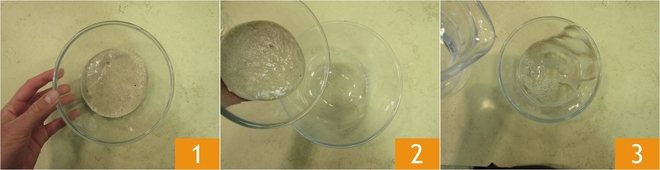 Um das Bauernbrot vorzubereiten, erfrischen Sie zuerst Ihren Sauerteig in Cremeform. Warten Sie 4 Stunden 1 und geben Sie ihn dann in eine große Schüssel 2. Gießen Sie 325 g Wasser in die Schüssel, die den Sauerteig enthielt 3.