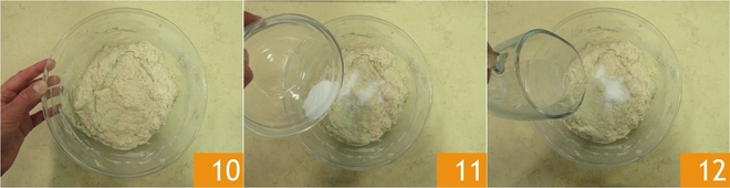 Lassen Sie es jetzt eine Stunde ruhen. Dieser Schritt wird Autolyse genannt. Nach einer Stunde nehmen Sie den Teig wieder 10, und Sie werden sofort bemerken, dass er beim Ziehen elastischer wird. Fügen Sie das Salz zum Teig hinzu 11 und gießen Sie nach und nach weitere 50 g Wasser hinzu 12.