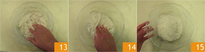 Drücken Sie mit den Fingerspitzen, um das Salz aufzulösen 13. Heben Sie jetzt vorsichtig einen der äußeren Teigränder an und bringen Sie ihn zur Mitte 14. Drehen Sie die Schüssel und setzen Sie diese Operation fort. Auf diese Weise wird das Wasser absorbiert und der Teig klebt nicht an den Händen. Die Hand wird nämlich nicht eingetaucht, sondern nur aufgelegt. Gießen Sie weiterhin Wasser ein und wiederholen Sie die Operation, zuerst den Teig drücken, dann in die Mitte bringen. Wie Sie sehen, beginnt der Teig nun Form anzunehmen. Geben Sie dem Teig Falten in der Schüssel, dann lassen Sie ihn 10 Minuten ruhen 15.