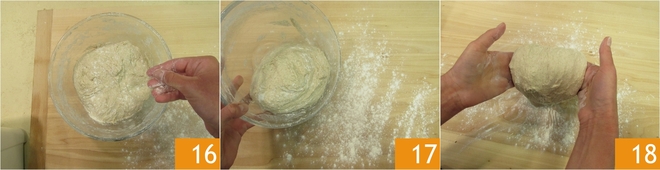 Bestäuben Sie ein Arbeitsbrett mit einer dünnen Mehlschicht, geben Sie ein wenig davon auf den Teig 16 und übertragen Sie ihn auf das Arbeitsbrett 17. Geben Sie ihm slap and fold Falten, heben Sie den Teig an und schlagen Sie ihn leicht auf das Arbeitsbrett, indem Sie einen Teil nach vorne bringen und umdrehen 18.