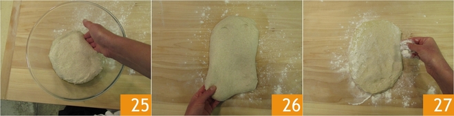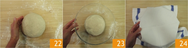 Wenn der Teig glatt ist 22, geben Sie ihn in eine Schüssel 23, decken Sie ihn mit einem Geschirrtuch ab und lassen Sie ihn 3 Stunden bei einer Temperatur von 26-28 °C aufgehen. Während dieser 3 Stunden sollten Sie dem Teig 4 Runden verstärkender Falten geben, um ihn noch stärker und dehnbarer zu machen.