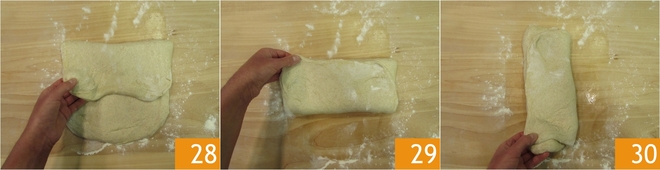 Bringen Sie den oberen Teigrand zur Mitte 28, nehmen Sie dann den unteren und klappen Sie ihn darüber 29. Drehen Sie ihn um 90° 30.