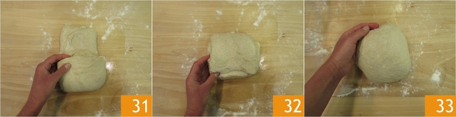 Machen Sie dasselbe auch von der anderen Seite. Bringen Sie den unteren Teigrand zur Mitte 31, nehmen Sie dann den oberen und klappen Sie ihn darüber 33. Drehen Sie ihn um, formen Sie ihn schnell, um eine Kugel zu erhalten 33.