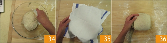 Übertragen Sie ihn erneut in die Schüssel 34 und decken Sie ihn mit einem Geschirrtuch ab 35. Diese Falten dienen dazu, dem Teig Kraft zu geben, der sonst zu entspannt wäre, also flach. Lassen Sie ihn 30 Minuten ruhen, dann übertragen Sie den Teig auf die Arbeitsfläche und geben ihm erneut eine Runde Falten wie gerade eben 36.