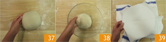 Formen Sie erneut eine Kugel 37, geben Sie sie in die Schüssel 38, decken Sie sie mit einem Tuch ab 39 und lassen Sie sie 30 Minuten ruhen. Wiederholen Sie diese Operation noch 2 Mal, wobei Sie immer die 30 Minuten Ruhezeit zwischen einer Falte und der nächsten einhalten, insgesamt 4 Falten.