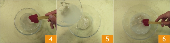 Mischen Sie, um eventuelle Rückstände aufzulösen 4 und gießen Sie alles in die große Schüssel, mit dem Sauerteig 5. Mischen Sie mit einem Spatel, um die Mischung abzukühlen 6.