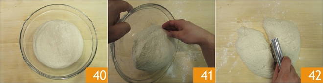 Nach den 3 Stunden hat der Teig sein Volumen verdoppelt 40. Bestäuben Sie erneut das Arbeitsbrett, kippen Sie die Schüssel und führen Sie den Teig mit den Händen hinunter 41. Teilen Sie den Teig in zwei Portionen von jeweils etwa 500 g 42.