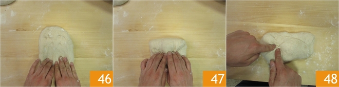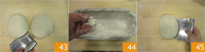 Ohne den Teig zu sehr zu bearbeiten, formen Sie mit dem Teigschaber zwei Kugeln 43 und lassen Sie sie 15 Minuten ruhen. Nehmen Sie nun zwei Gärkörbchen, die etwa 27x10 cm groß oder jedenfalls für 500 g Teig geeignet sind. Wenn Sie keine haben, legen Sie ein Baumwolltuch hinein. Bestäuben Sie das Innere der Körbchen gut mit Mehl 44, da der Teig sehr hydriert ist. Formen Sie jetzt Ihr Brot: Bestäuben Sie die Arbeitsfläche mit Mehl und legen Sie eine der beiden Portionen darauf 45.