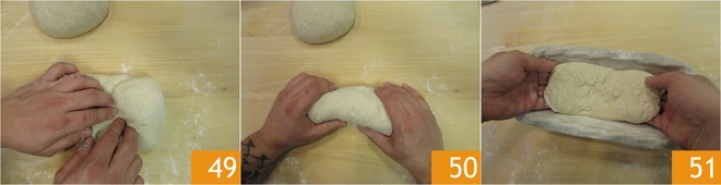Zum Schluss heben Sie den rechten Rand an und bringen Sie ihn zur Mitte 49. Drehen Sie ihn um und rollen Sie ihn auf der Arbeitsfläche, um einen Laib zu formen 50. Wiederholen Sie den gleichen Vorgang für das zweite Brot, heben Sie dann eines mit dem Teigschaber an und legen Sie es in das Gärkörbchen, indem Sie es kopfüber umdrehen, damit die glatte Seite unten ist 51.
