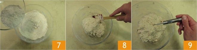 Fügen Sie dann das Mehl Typ 2 und das Roggenmehl hinzu 7. Mischen Sie weiterhin mit dem Spatel und reinigen Sie die Ränder der Schüssel gut von Mehl, bis Sie eine einigermaßen homogene, aber noch nicht glatte Mischung erhalten 8. Es ist normal, dass der Teig in dieser Phase dazu neigt, zu reißen, da das Glutennetz noch nicht gut ausgebildet ist. Überprüfen Sie immer die Temperatur des Teigs, da der Sauerteig sehr temperaturempfindlich ist. Der Teig sollte immer eine Temperatur von etwa 27-28 °C haben 9.