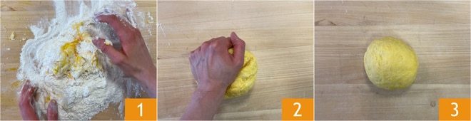 Um die Lasagne alla Norma zuzubereiten, formen Sie zuerst das Mehl zu einem Haufen, schlagen Sie die Eier in die Mitte und fügen Sie eine Prise Salz hinzu. Mit einer Gabel schlagen Sie die Eier auf und integrieren nach und nach das Mehl, dann kneten Sie mit den Händen weiter 1 2, bis Sie einen glatten und homogenen Teigball 3 erhalten. Wickeln Sie ihn in Frischhaltefolie und lassen Sie ihn 30 Minuten im Kühlschrank ruhen.