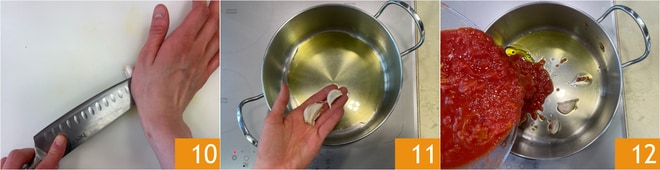 Beschäftigen Sie sich nun mit der Zubereitung der Soße. Drücken Sie den ungeschälten Knoblauch 10 und geben Sie ihn in einen Topf mit etwas Öl 11 und lassen Sie ihn einige Minuten anbraten. Fügen Sie die geschälten Tomaten hinzu 12, die zuvor mit den Händen oder einer Gabel zerdrückt wurden.
