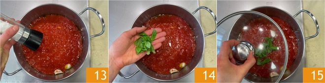 Würzen Sie mit Salz und Pfeffer 13, fügen Sie das Basilikum hinzu 14, decken Sie mit einem Deckel ab 15 und lassen Sie es 15-20 Minuten kochen, oder bis die Soße dick ist.