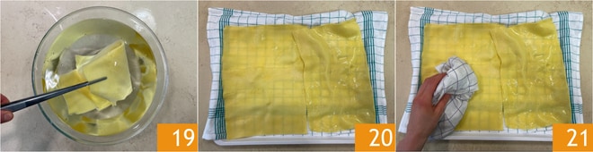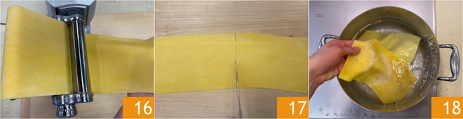 Nehmen Sie den Teigball aus dem Kühlschrank und rollen Sie ihn mit einem Nudelholz 16 oder einer Nudelmaschine aus, bis Sie dünne Blätter von 1-2 mm Dicke erhalten. Schneiden Sie sie auf die Größe der Auflaufform, die Sie verwenden werden, wir haben eine 30x20 cm verwendet 17, tauchen Sie sie dann in kochendes Salzwasser und kochen Sie sie für einige Minuten 18.