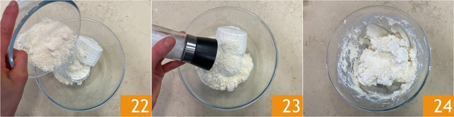 In einer Schüssel geben Sie den Ricotta, fügen Sie den geriebenen Parmesan hinzu 22, würzen Sie mit Salz und Pfeffer 23. Mischen Sie, bis Sie eine homogene Creme erhalten 24.