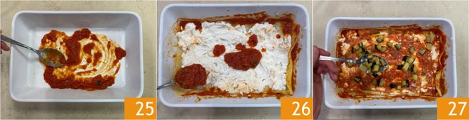 Setzen Sie die Lasagne zusammen, indem Sie etwas Soße auf den Boden der 30x20 cm großen Auflaufform geben 25, fügen Sie die Teigblätter hinzu und bestreichen Sie sie mit der Ricotta-Creme, fügen Sie mehr Soße hinzu 26, gleichmäßig über die gesamte Oberfläche verteilt, und die gebratenen Auberginen 27.