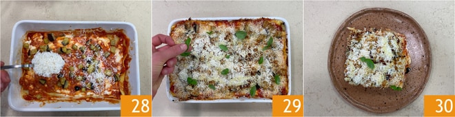 Mit gesalzenem Ricotta bestreuen 28. Wiederholen Sie das gleiche Verfahren, bis alle Zutaten aufgebraucht sind. Backen Sie im statischen Ofen bei 180°C für 20-25 Minuten, oder bis die Oberfläche knusprig und goldbraun ist. Garnieren Sie die Oberfläche mit frischen Basilikumblättern 29. Die Lasagne alla Norma ist bereit zum Genießen 30.