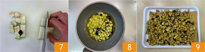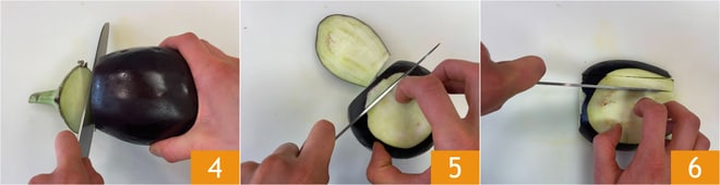 In der Zwischenzeit entfernen Sie den Stiel der Aubergine 4, schneiden Sie sie dann zuerst in Scheiben 5 und dann in Streifen 6.