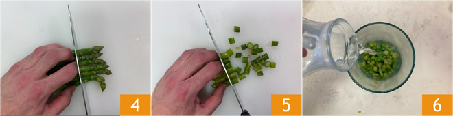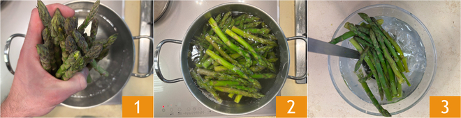 Um die Lasagne aus pane carasau mit Spargel zuzubereiten, beginnen Sie mit dem Spargel: Nachdem Sie die holzigen Enden entfernt haben, kochen Sie sie 1 für einige Minuten in Wasser oder bis sie leicht weich sind 2. Abgießen und in Eiswasser legen, um den Garvorgang zu stoppen 3.