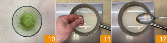 Stellen Sie die entstandene Creme beiseite 10 und kümmern Sie sich um die Sojabechamel: Gießen Sie das Getränk in einen kleinen Topf mit Salz 11 und Muskatnuss 12. Erwärmen Sie es bis zu einem leichten Siedepunkt.