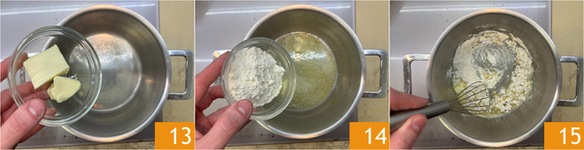 In der Zwischenzeit schmelzen Sie die Butter in einem kleinen Topf 13, geben Sie das Mehl hinzu 14 und rühren Sie kontinuierlich mit dem Schneebesen, bis der Roux goldbraun ist 15.