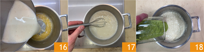 Nun können Sie die heiße Milch 16 hinzufügen, rühren Sie mit dem Schneebesen und kochen Sie, bis es eine flüssige Creme wird 17. Schalten Sie die Hitze ab und behalten Sie ein paar Löffel beiseite, zum Rest der Sojabechamel können Sie die beiseite gestellte Spargelcreme hinzufügen 18.