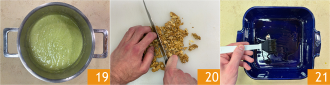 Rühren Sie gut um 19. Jetzt müssen Sie nur noch die Walnusskerne grob hacken 20 und können mit dem Zusammenstellen der Lasagne beginnen. Fetten Sie den Boden einer quadratischen Auflaufform von 25 cm ein 21.