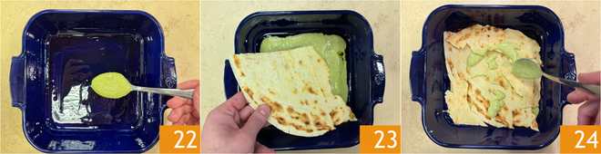 Verteilen Sie die Bechamel mit Spargel 22, dann das pane carasau, machen Sie sich keine Sorgen, es zu brechen, wichtig ist, den Boden zu bedecken 23, und dann noch etwas Bechamel mit Spargel 24.