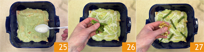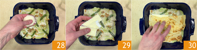 Fahren Sie fort mit der Bechamel mit Spargel und der Sojabechamel, den Spargelspitzen 31, dem geriebenen Parmigiano Reggiano und dem Brie in Scheiben 32. Wiederholen Sie dies für weitere zwei Schichten 33
