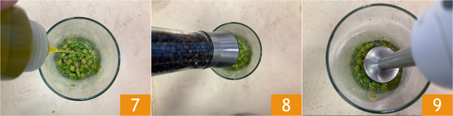 Fügen Sie das Öl hinzu 7, salzen und pfeffern Sie 8. Pürieren Sie fein mit dem Stabmixer, und fügen Sie bei Bedarf Wasser hinzu 9.