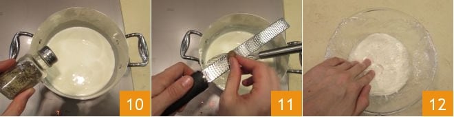 Würzen Sie Ihre Bechamelsauce mit einer Prise Pfeffer 10, Salz, einer Prise Muskatnuss 11 und kochen Sie weiter, immer rührend, für 5-6 Minuten, bis die gewünschte Konsistenz erreicht ist. Zu diesem Zeitpunkt die Bechamelsauce in eine Schüssel geben und mit Frischhaltefolie abdecken 12.