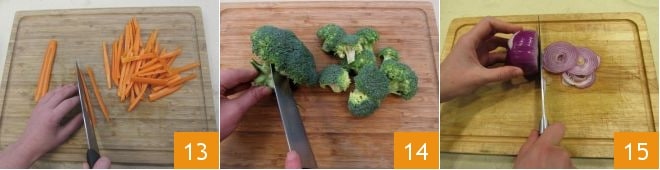 Waschen Sie das gesamte Gemüse und beginnen Sie mit dem Schneiden: Die Karotten schälen und in Julienne schneiden 13, bei den Brokkoli nur die Röschen nehmen 14 und die Zwiebel fein schneiden 15.