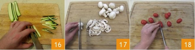 Die Zucchini abschneiden und ebenfalls in Julienne schneiden 16. Die Pilze reinigen, sie in Scheiben schneiden 17 und die Kirschtomaten halbieren 18.