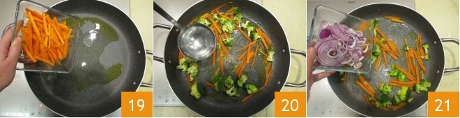 Sobald das gesamte Gemüse vorbereitet ist, das Öl in einen Topf geben und zuerst die Karotten hinzufügen 19, ein paar Minuten kochen lassen und dann auch die Brokkoli hinzufügen. Mit etwas Wasser ablöschen 20, mit einem Deckel abdecken und 3-4 Minuten kochen lassen. Zu diesem Zeitpunkt die Zwiebeln hinzufügen 21.