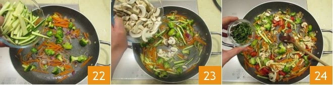Zum Schluss die Zucchini 22 und die Pilze 23 hinzufügen und gelegentlich umrühren. Sobald sie gekocht sind, salzen und pfeffern, dann die Hitze ausschalten und die Kirschtomaten und den Thymian hinzufügen 24.