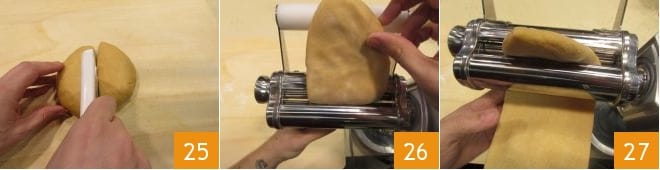 Inzwischen hat Ihr Eierteig geruht, also nehmen Sie den Teigklumpen und teilen Sie ihn in zwei Hälften 25. Rollen Sie den Teig mit der Nudelmaschine aus 26, indem Sie die Dicke jedes Mal verringern 27.