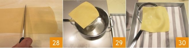 Sie sollten Blätter mit einer Dicke von etwa 2 mm erhalten. Schneiden Sie aus den Blättern 8 Rechtecke in der Größe von 15x20 cm aus 28. Blanchieren Sie die Blätter für 1 Minute in leicht gesalzenem kochendem Wasser 29, dann abgießen und auf ein mit einem Küchentuch ausgelegtes Tablett legen 30. Wenn Sie möchten, können Sie die Teigblätter schnell in eine Schüssel mit kaltem Wasser tauchen, um das Kochen zu stoppen, und dann die Rechtecke auf einem sauberen Tuch auslegen. Wichtig ist, die verschiedenen Rechtecke gut ausgebreitet und ohne Überlagerung zu legen.